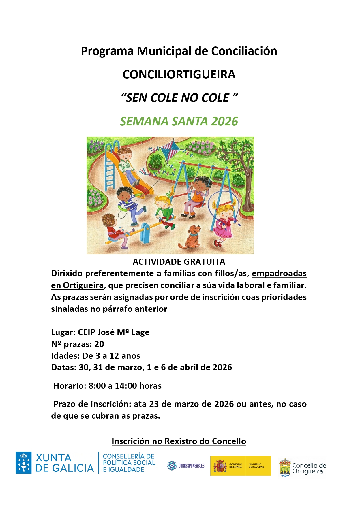 "Sen Cole no Cole" es una iniciativa gratuita, dirigida preferentemente a familias empadronadas en el Ayuntamiento de Ortigueira que tengan menores de entre 3 y 12 años. La actividad se desarrollará en las instalaciones del CEIP José Mª Lage, de 8:00 a 14:00 horas, durante el periodo no lectivo de Semana Santa. Las plazas se adjudicarán por orden de inscripción.