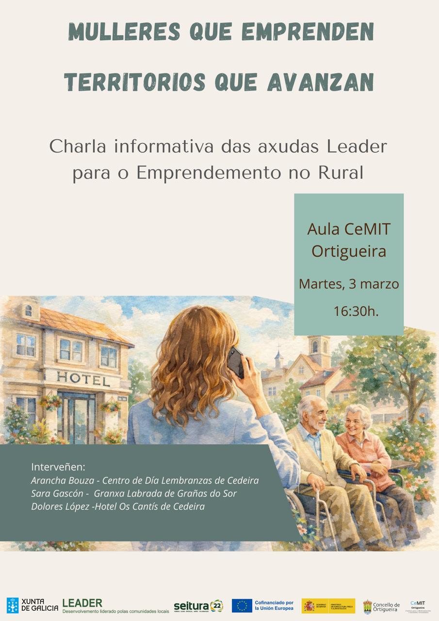 Con motivo do 8M, a Aula CeMIT de Ortigueira acollerá unha charla informativa sobre as Axudas Leader para o Emprendemento Rural, enfocadas ao emprendemento, á amplificación ou á diversificación do teu negocio.