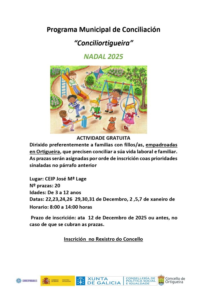 “Sen Cole no Cole” é unha iniciativa de balde, dirixida preferentemente ás familias empadroadas no Concello de Ortigueira que teñan menores a cargo con idades comprendidas entre 3 e 12 anos. A actividade desenvolverase nas instalacións do CEIP José Mª Lage, en horario de 8:00 a 14:00 horas, durante o período non lectivo do nadal. As prazas serán asignadas por orde de inscrición.
