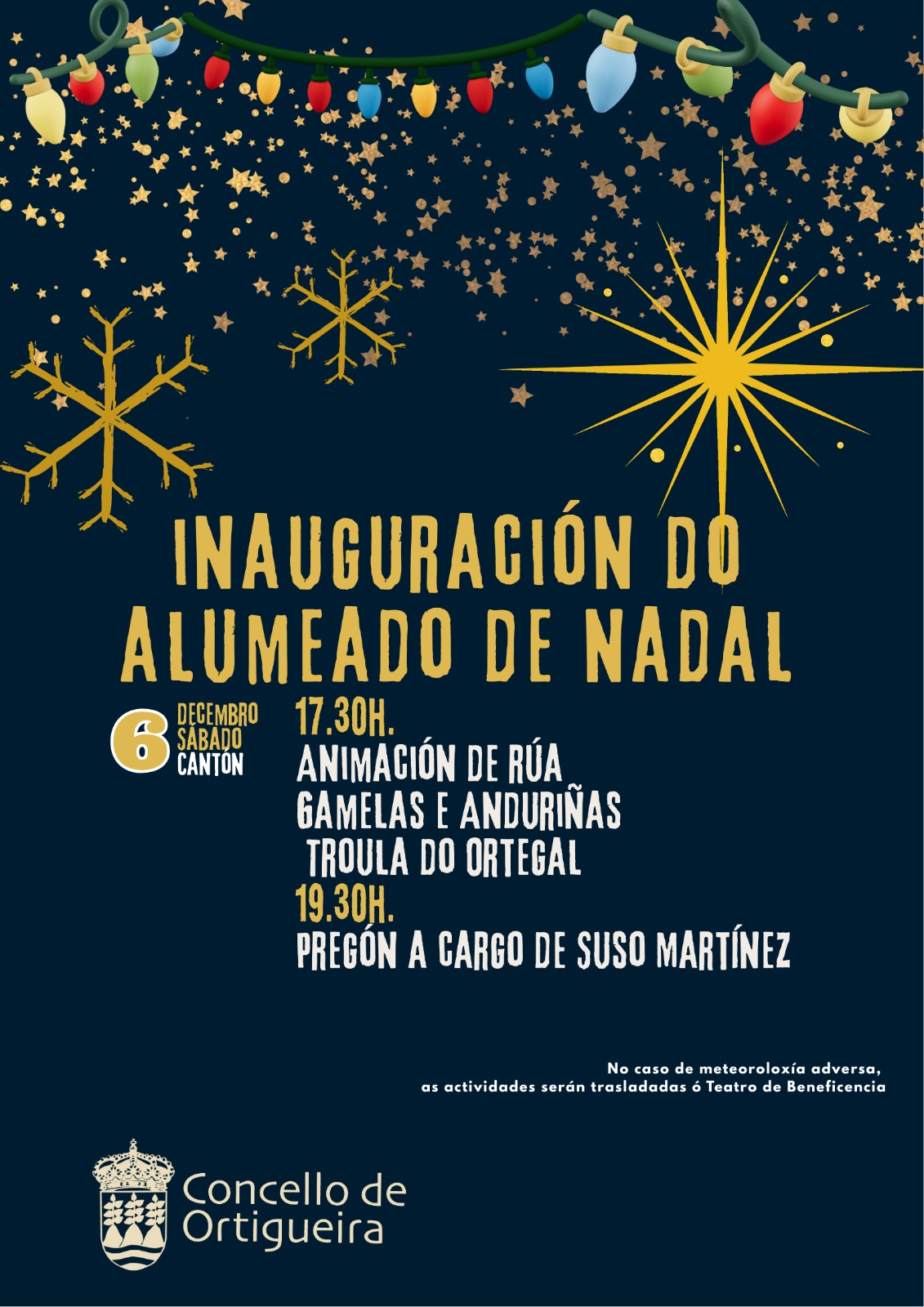 O acto de inauguración, co aceso de luces do municipio, está marcado para o 6 de decembro, no Cantón. Dará comezo a partir das 17:30 h c0as actuacións de ‘Animación de rúa’, ‘Gamelas e Anduriñas’ e ‘Troula do Ortegal’ para, ás 19:30 h, dar paso ao pregón a cargo do actor e historiador, Suso Martínez. En caso de meterología adversa, as actividades trasladaranse ao Teatro da Beneficiencia.