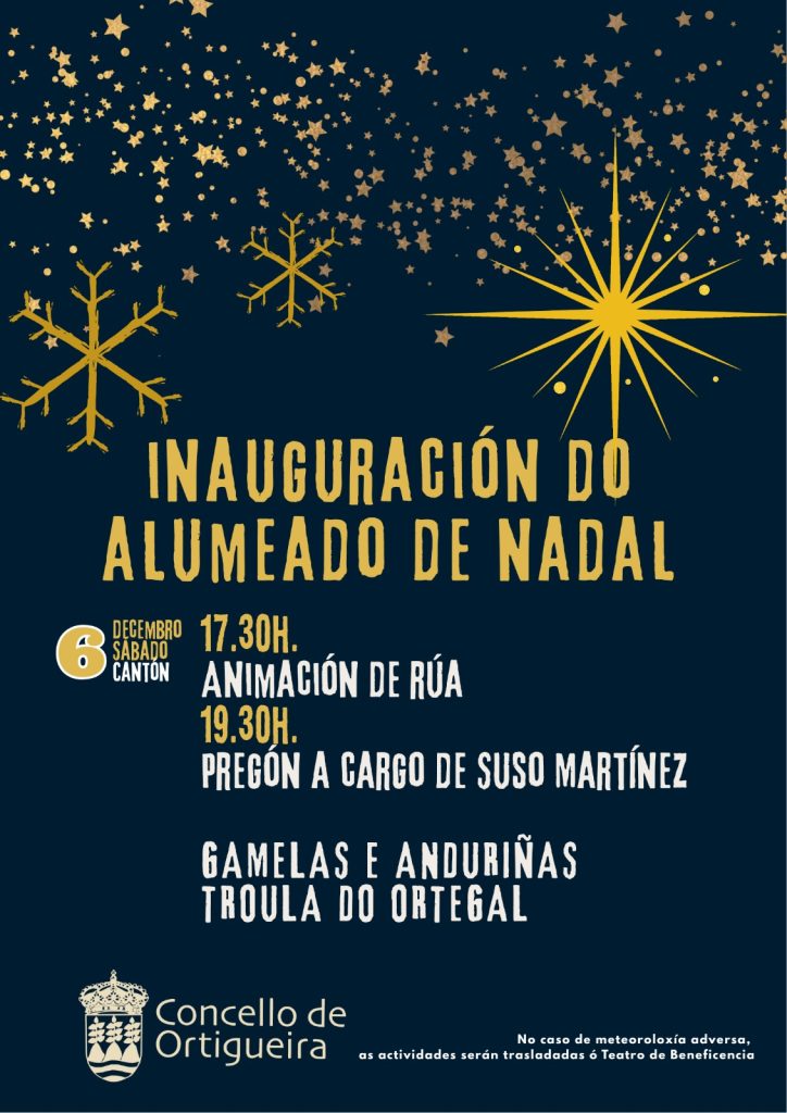 O acto de inauguración, co aceso de luces do municipio, está marcado para o 6 de decembro, no Cantón. Dará comezo a partir das 17:30 h c0a actuación de ‘Animación de rúa’, para, ás 19:30 h, dar paso ao pregón a cargo do actor e historiador, Suso Martínez. Posteriormente, ‘Gamelas e Anduriñas’ e ‘Troula do Ortegal’ poñerán a música para pechar a xornada. En caso de meterología adversa, as actividades trasladaranse ao Teatro da Beneficiencia.